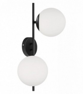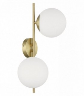 Aplique con dos luces apta para espacios domésticos de estilo art-deco. De diseño sobrío y elegante, está realizada en cuerpo metálico con pantalla esférica de cristal blanco y disponible en dos colores; negro y latón...